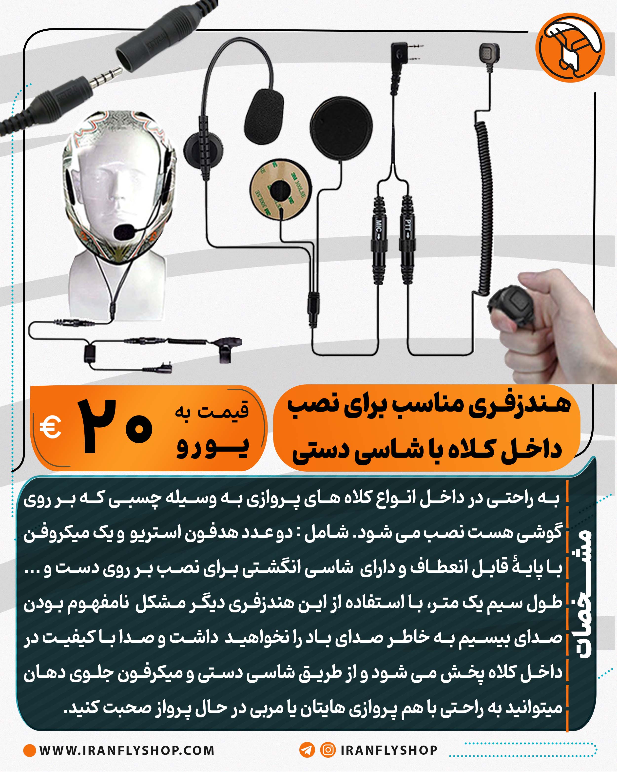 به راحتی در داخل انواع کلاه های پروازی به وسیله چسبی که بر روی گوشی هست نصب می شود. شامل : دو عدد هدفون استریو و یک میکروفن با پایۀ قابل انعطاف و دارای شاسی انگشتی برای نصب بر روی دست و ... طول سیم یک متر، با استفاده از این هندزفری دیگر مشکل نامفهوم بودن صدای بیسیم به خاطر صدای باد را نخواهید داشت و صدا با کیفیت در داخل کلاه پخش می شود و از طریق شاسی دستی و میکرفون جلوی دهان میتوانید به راحـتی با هم پـروازی هایتان یا مربی در حـال پـرواز صحبت کنید
