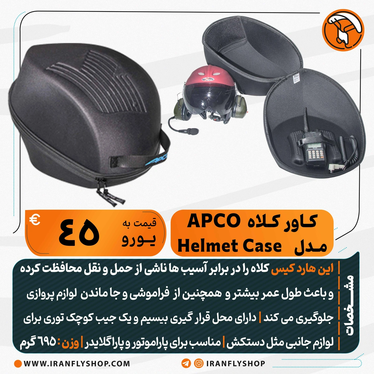 این هارد کیس کلاه را در برابر آسیب ها ناشی از حمل و نقل محافظت کرده و باعث طول عمر بیشتر و همچنین از فراموشی و جا ماندن لوازم پروازی جلوگیری می کند | دارای محل قرار گیری بیسیم و یک جیب کوچک توری برای لوازم جانبی مثل دستکش | مناسب برای پاراموتور و پاراگلایدر | وزن : 695 گرم