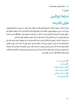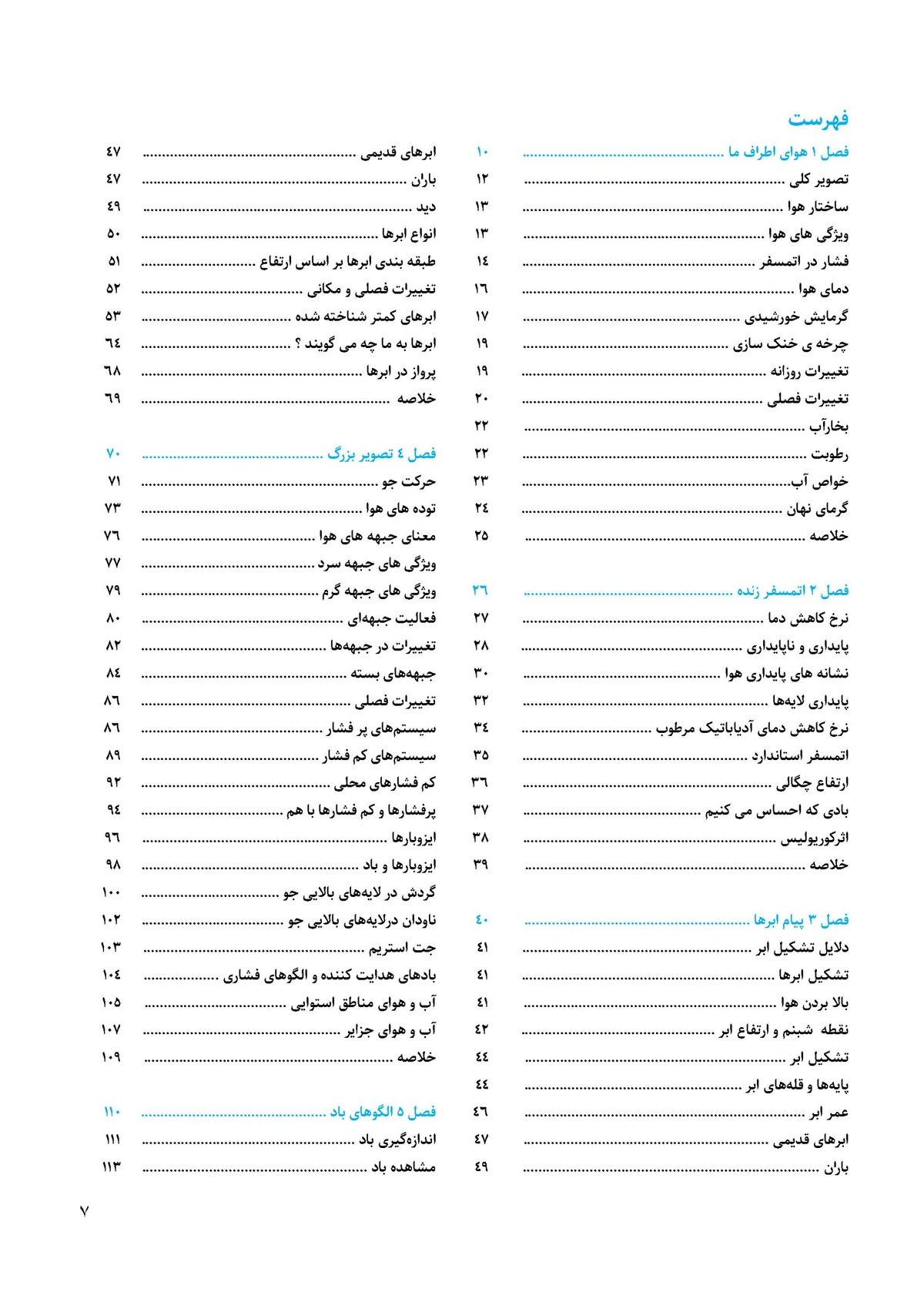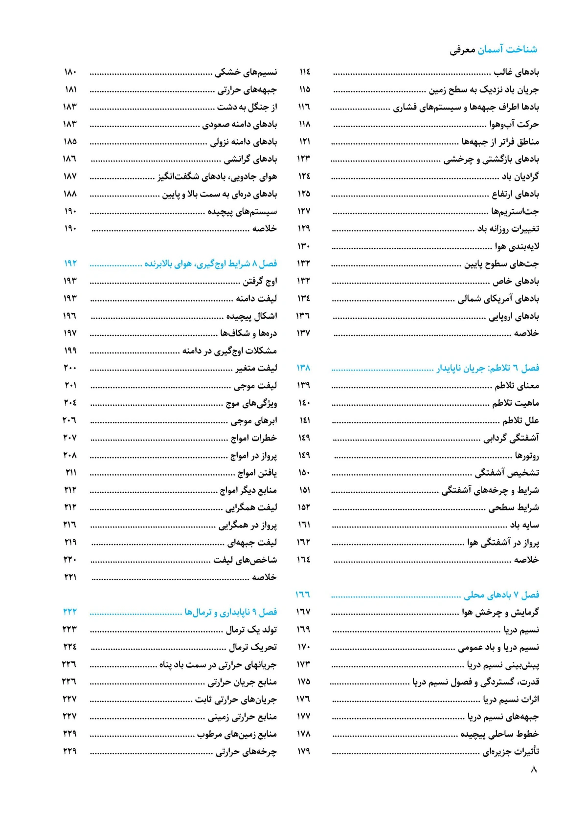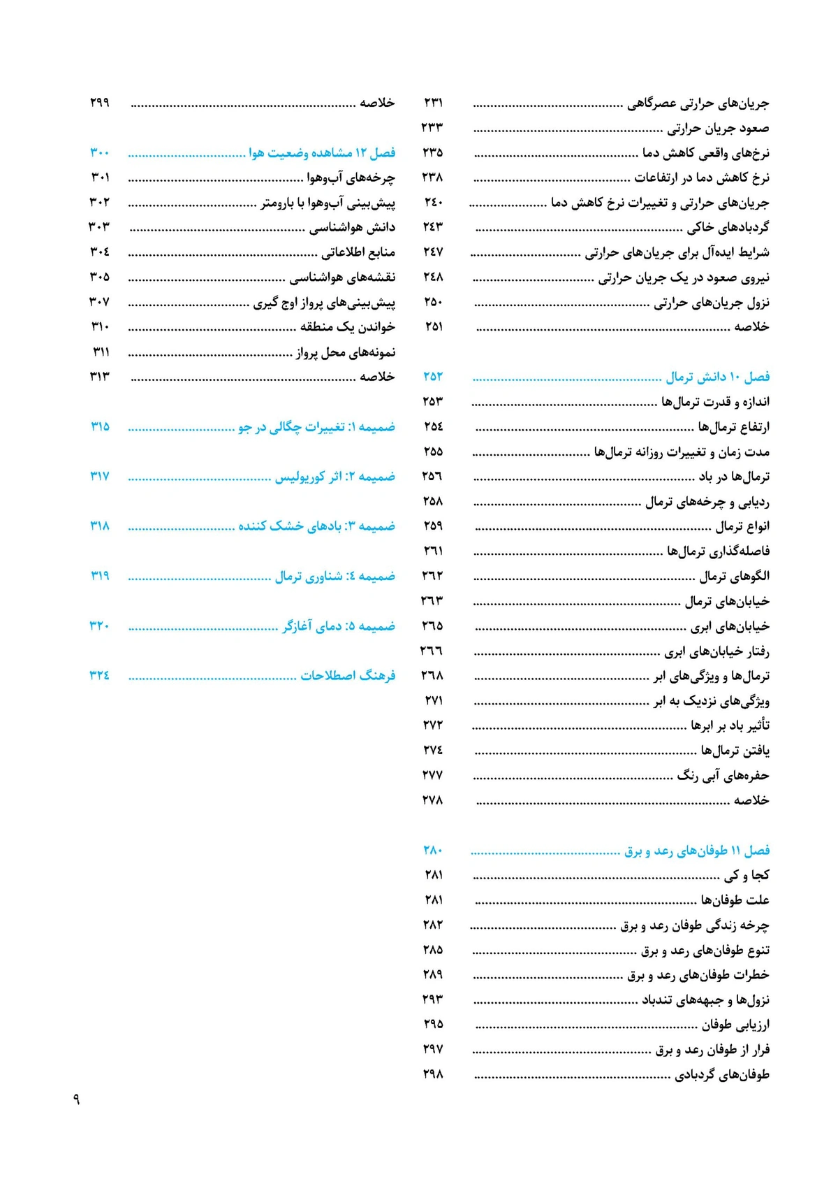 کتاب در دوازده فصل جمع آوری شده که بیشتر به مطالب میکرو هواشناسی پرداخته اتمسفر،ابرها، انواع باد، تلاطم، جبههها، ترمالها و ...| بیش از 200 عکس و نمودار رنگیهوانوردی | 330 صفحه رنگی