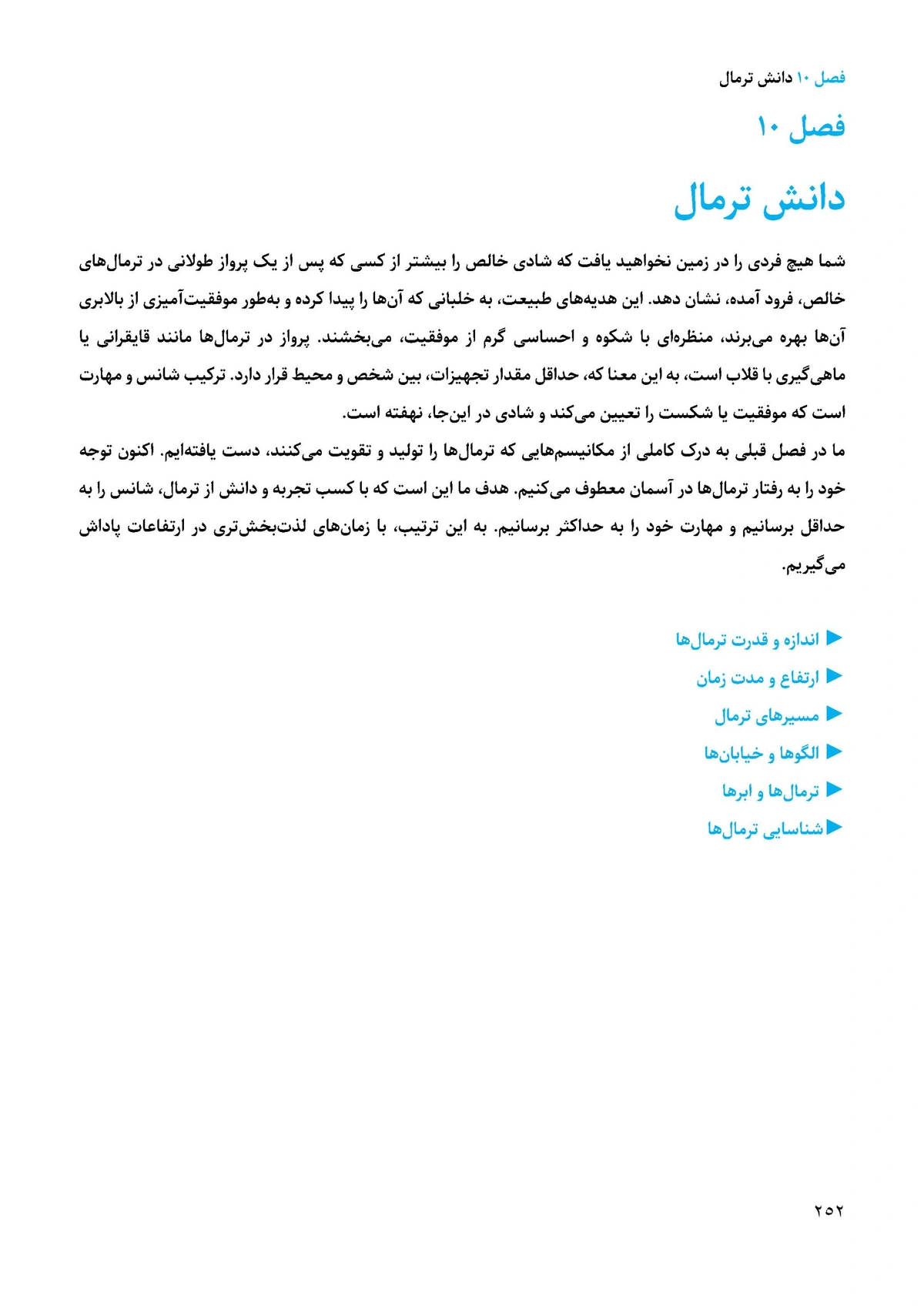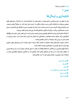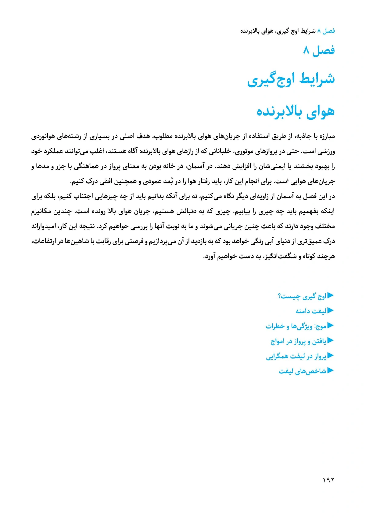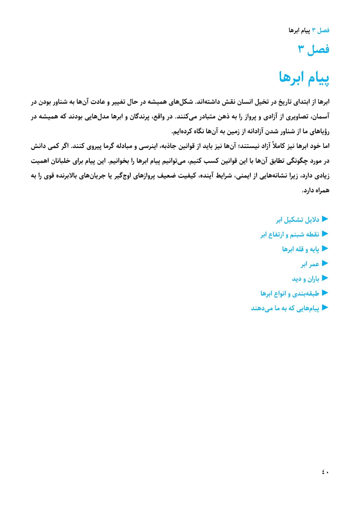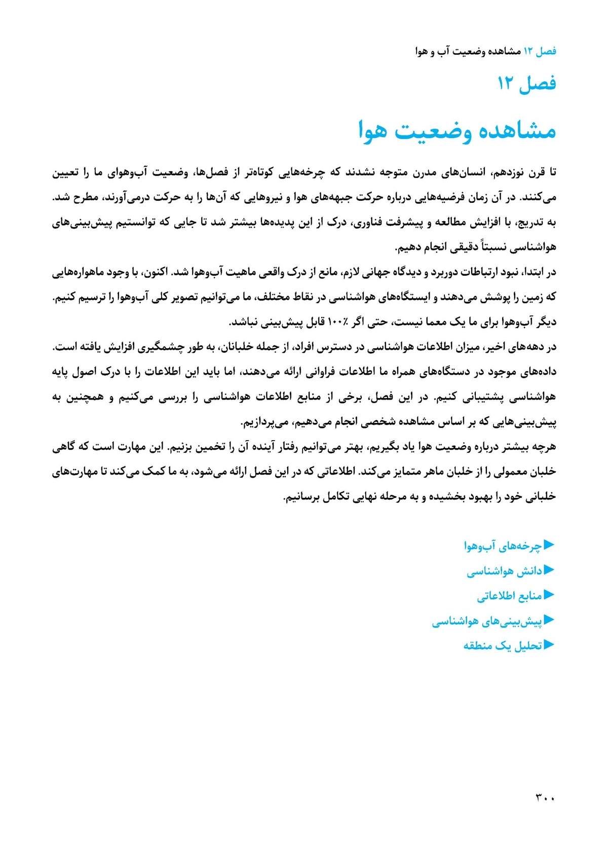 کتاب در دوازده فصل جمع آوری شده که بیشتر به مطالب میکرو هواشناسی پرداخته اتمسفر،ابرها، انواع باد، تلاطم، جبههها، ترمالها و ...| بیش از 200 عکس و نمودار رنگیهوانوردی | 330 صفحه رنگی