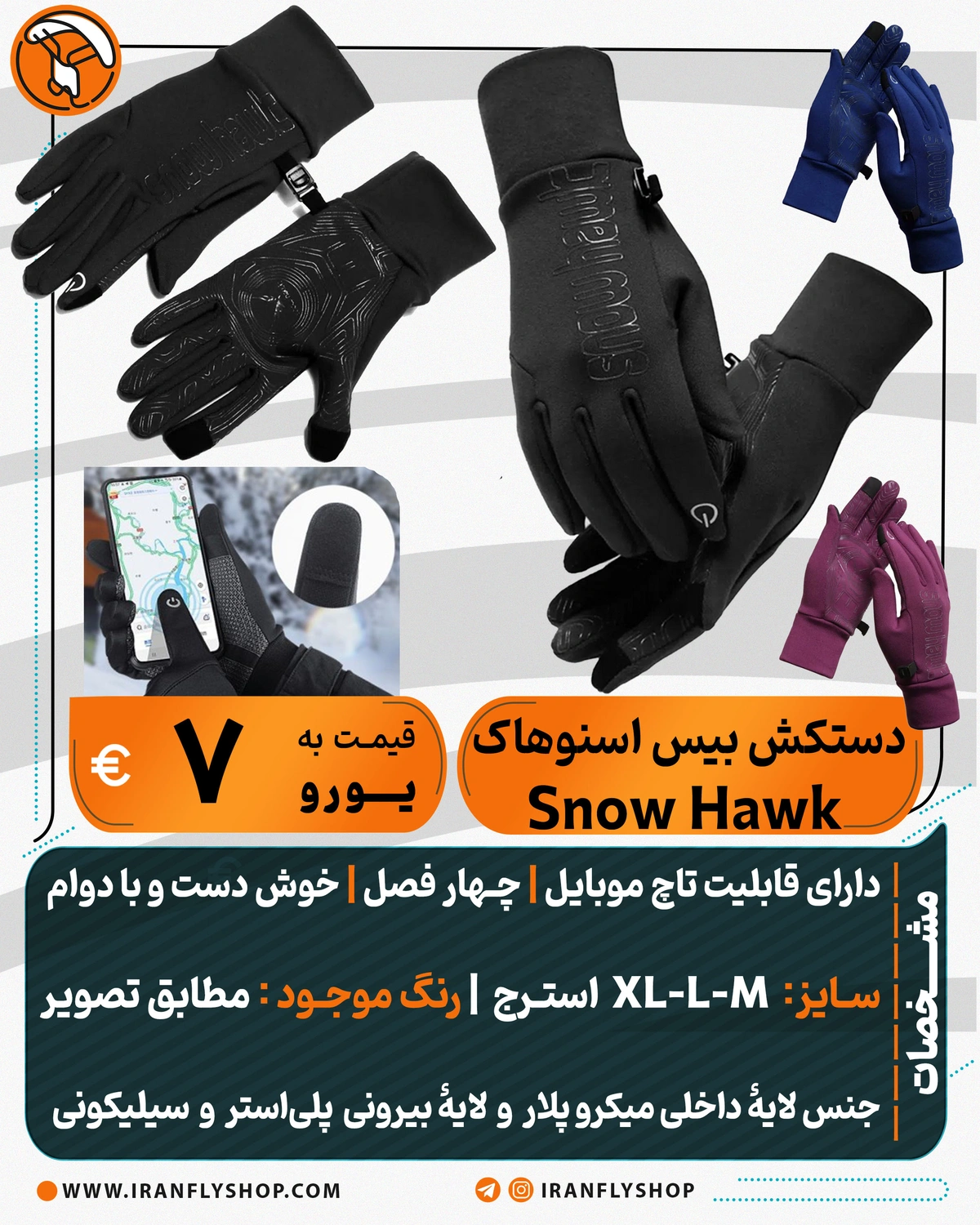 جنس لایۀ داخلی میکرو پلار و لایۀ بیرونی پلیاستر و سیلیکونی ضدلغزش کف دست